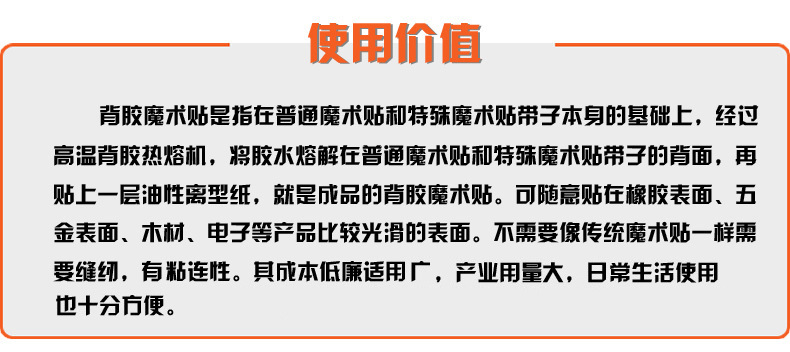 產品應用魔術貼產品廣泛用于服裝、鞋子、帽子、手套、皮包、沙發、車船、座墊、航空用品、雨披、窗簾、玩具、睡袋、體育運動器材、音響器材、醫療器械、帳篷、小輪車護套、各類軍工產品、電子電線、充電器、陳列用具等。