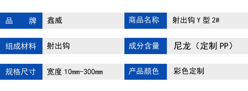 鑫威織造彩色尼龍射出勾 Y 型,采用高精度尼龍原料一體射出成型,Y 型勾齒排列均勻、咬合密實,搭配毛面貼合緊密,剝離強度與橫向拉力穩定出眾,反復開合不易松脫,耐用性遠超傳統織造勾。