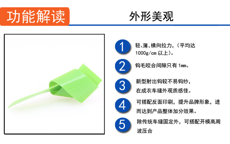勾尖圓潤不傷手、不勾紗,適配嬰兒用品、服裝鞋帽等親膚場景;耐高低溫、抗老化,戶外裝備、醫療器材、汽車內飾等復雜環境也能穩定使用。支持多色定制,滿足品牌視覺與功能雙需求;可車縫 / 熱壓 / 背膠加工,貼合平整美觀,提升產品質感。