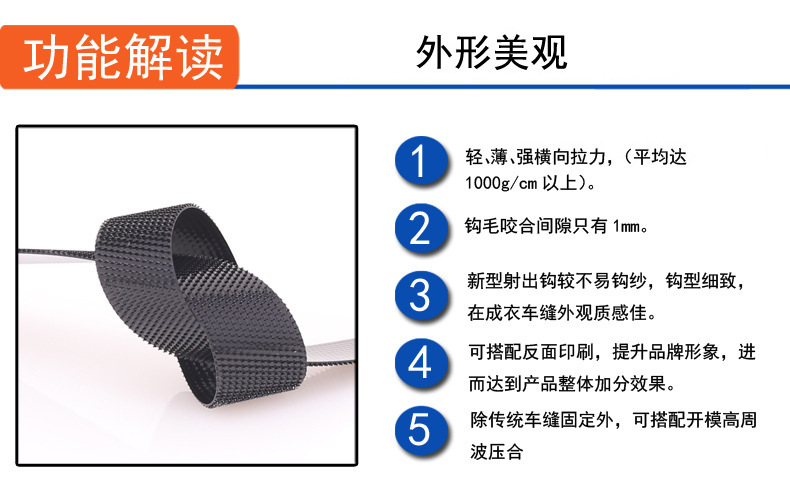 產品材質可根據產品的需求,運用不同(滌綸、滌綸與尼龍混合、尼龍、尼龍A級、不抓毛等)材質的魔術貼。
