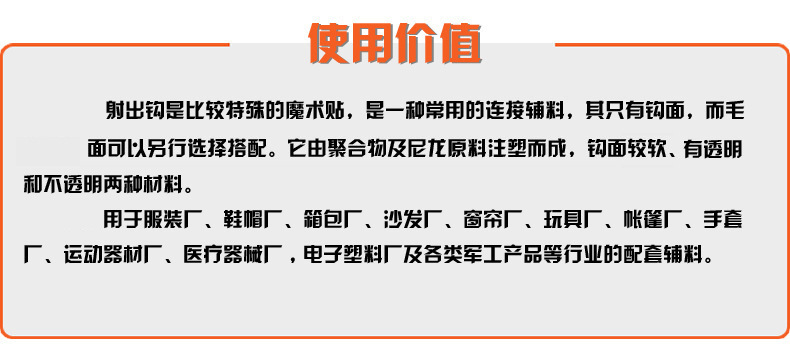 產品應用魔術貼產品廣泛用于服裝、鞋子、帽子、手套、皮包、沙發、車船、座墊、航空用品、雨披、窗簾、玩具、睡袋、體育運動器材、音響器材、醫療器械、帳篷、小輪車護套、各類軍工產品、電子電線、充電器、陳列用具等。