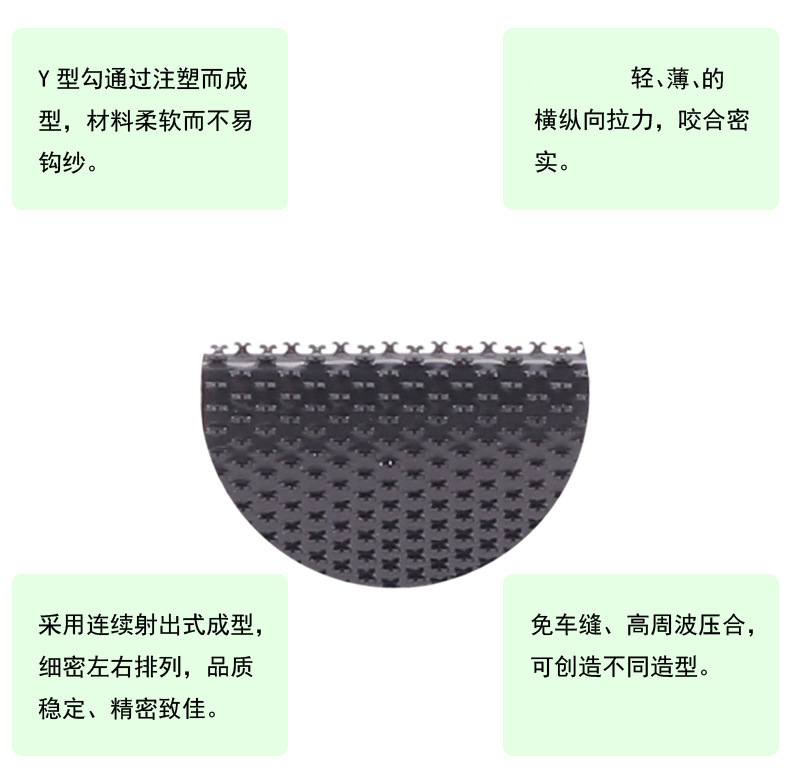 鑫威織造黑色射出勾 Y 型 3#,采用優質尼龍原料精密注塑成型,勾面細膩均勻、Y 型雙勾設計咬合更穩,黑色啞光質感高級,適配各類高端輔料場景。產品超薄柔軟、不刮膚、不勾紗,靜音開合,反復粘貼數千次仍保持強勁粘力,耐用性遠超普通魔術貼。